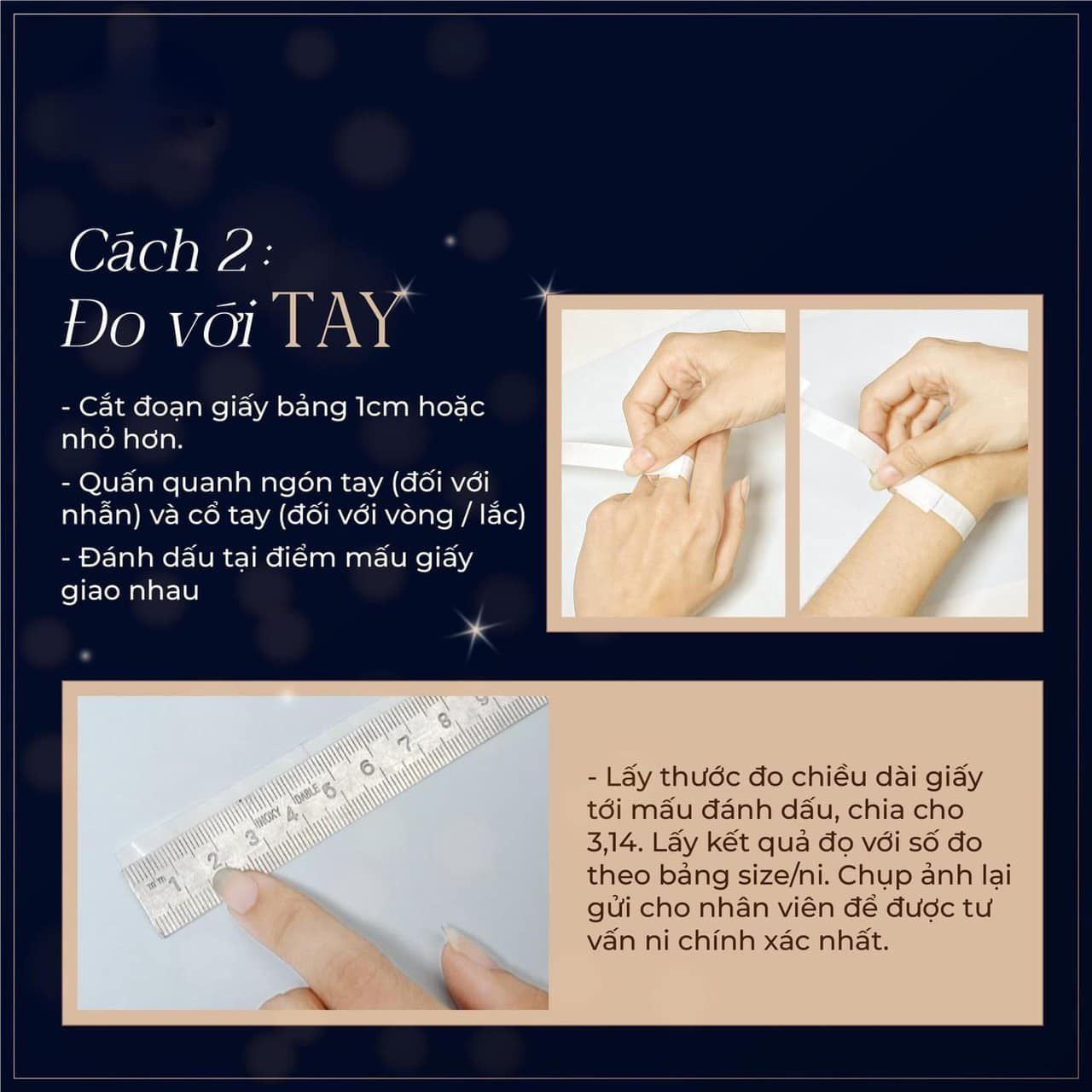 Bước 5: Tháo ra dùng thước đo chiều dài của đoạn giấy từ điểm đầu cho đến phần đánh dấu. Lấy kết quả đo được chia cho 3,14. Sau đó đối chiếu với Bảng size nhẫn.